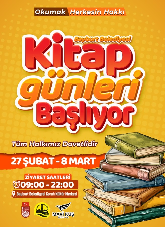 “Okumak herkesin hakkı” sloganıyla hayata geçirilen etkinlik, 27 Şubat – 8 Mart 2026 tarihleri arasında kültür ve edebiyat dünyasını Bayburt’ta bir araya getirecek. Birçok yayınevinin katılım sağlayacağı Kitap Günleri’nde okurlar, sevdikleri kitaplara ulaşma fırsatı yakalayacak.
