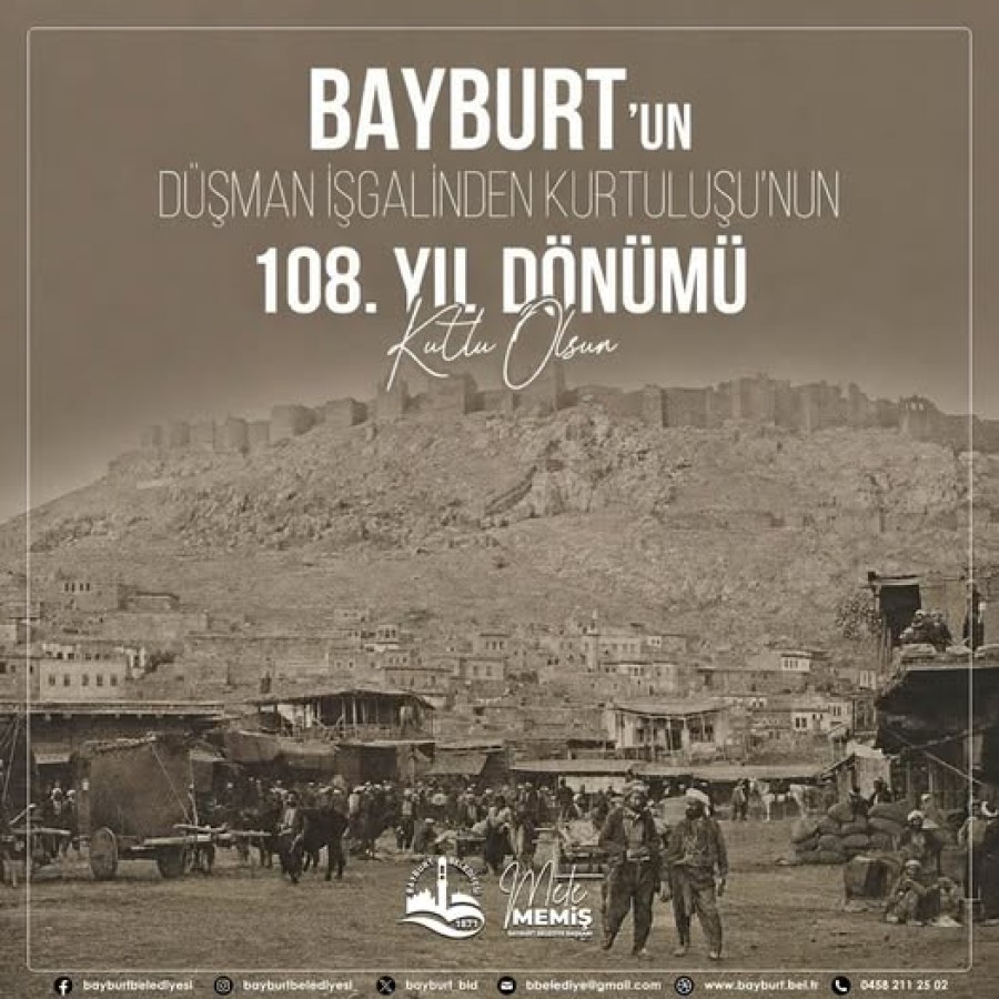 Belediye Başkanımız Sayın Mete Memiş Bayburt’un Düşman İşgalinden Kurtuluşu’nun 108. Yıl Dönümü dolayısıyla yayınladığı mesajında şu ifadelere yer verdi:
