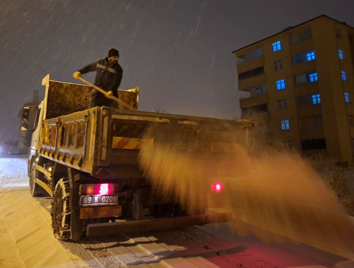 Bayburt’ta akşam saatlerinde etkisini artıran kar yağışıyla birlikte karla mücadele ekiplerimiz, yağışın başladığı andan itibaren sahaya inerek yoğun bir çalışma başlattı.