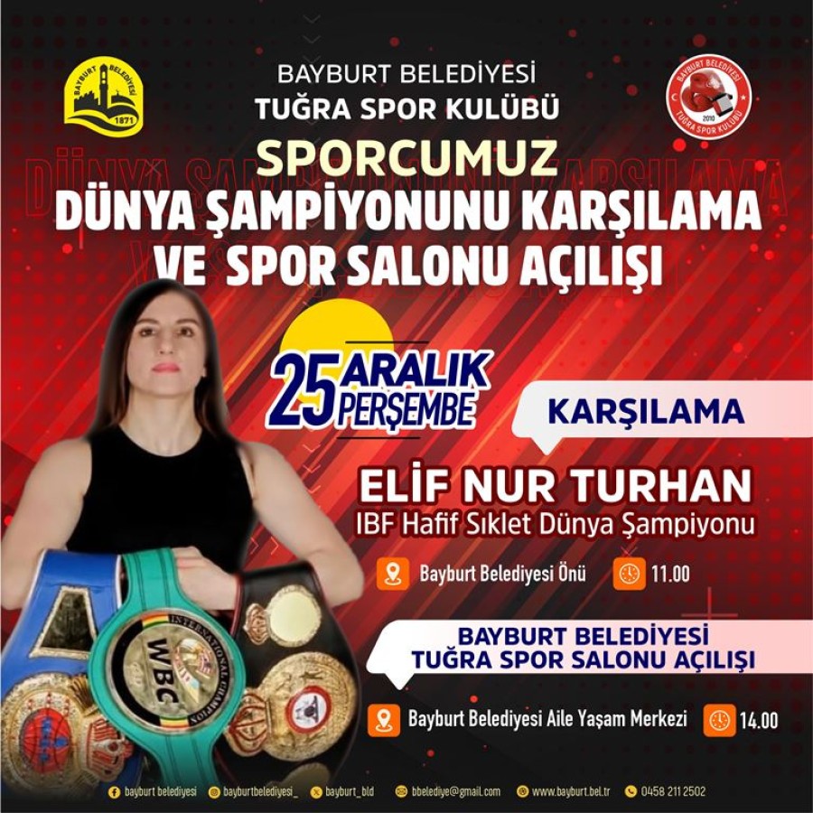 6 Aralık’ta Monte Carlo’da gerçekleşen karşılaşmada Brezilyalı rakibi Beatriz Ferreira’yı 5. raundda nakavt ederek IBF Kadınlar Hafif Sıklet Dünya Şampiyonu olan Belediyemiz Tuğra Spor Kulübü sporcumuz Elif Nur Turhan, yarın Bayburt’ta olacak.